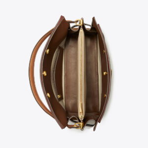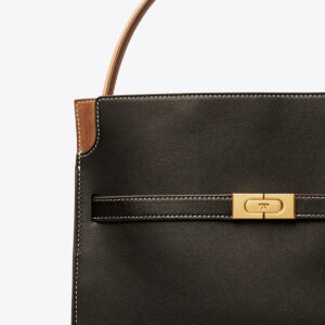 Lee Radziwill Double Bag contrasts structure and softness, mixed materials, different colors. Composed of layers that unfold like the collar of a trench coat, it can be worn open, semi-buttoned or fully closed. Beautifully crafted in leather and suede, with signature lock-and-key hardware. The collection is named for Lee Radziwill, who was fearlessly unique.